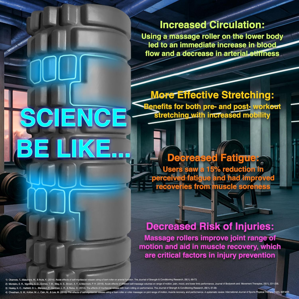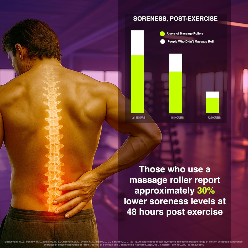 • Reduces muscle soreness: research shows foam rolling post-exercise reduces delayed onset muscle soreness (DOMS) by 30–50% when done consistently